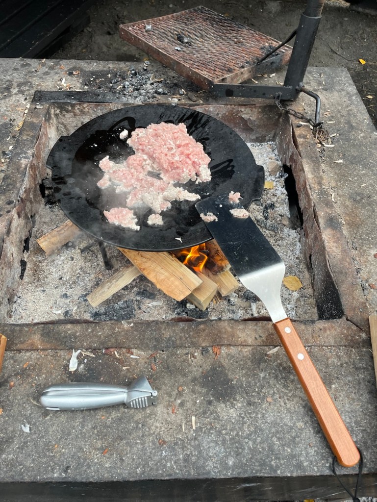 Tände en brasa i grillplatsen. Stekte på kycklingfärsen i rapsolja.