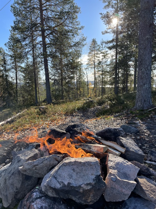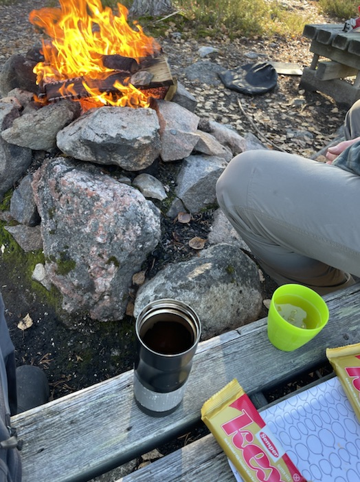 Vi flyttade sen bänken närmare elden och drack te och åt kexchoklad till efterrätt. Vi värmde våra frusna fingrar över den värmande elden. Efter det började vi vår vandring ner. Robert Aschberg berättade att man ska se en bergstopp nerifrån. Vi valde tvärtom.