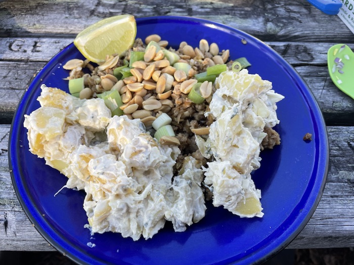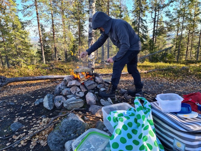 Till förrätt löjrom på knäckebröd med röd lök och planti. Jag hade med mig ingredienser till asiatisk färspanna. Det blåste kalla vindar och vinden ven i telemasten och trädkronorna. Solen strålade mellan träden.