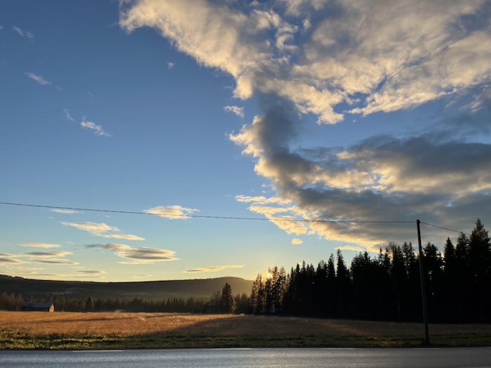 Körde längs en enormt vacker älvdal med de sista solstrålarna som lyste över älven och mellan träden. Vid Vuollerim var det snö på vägen och en dimma lade sig över nejderna. Stannade i Jokkmokk på OKQ8 för att låna toaletten och åt sen en sallad i bilen. Körde mot Ligga kraftverk för att ta av vägen mot Muddus Nationalpark.