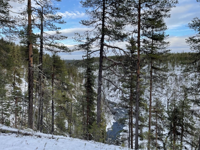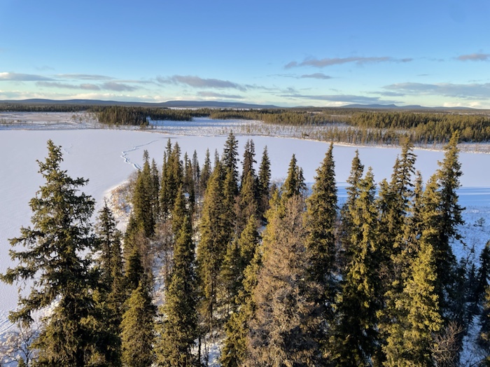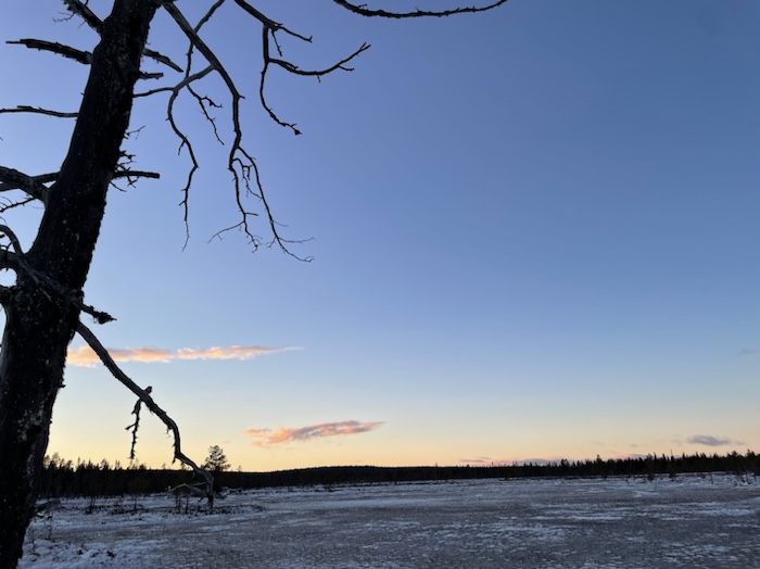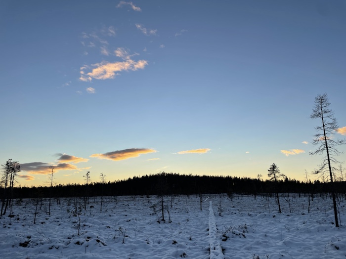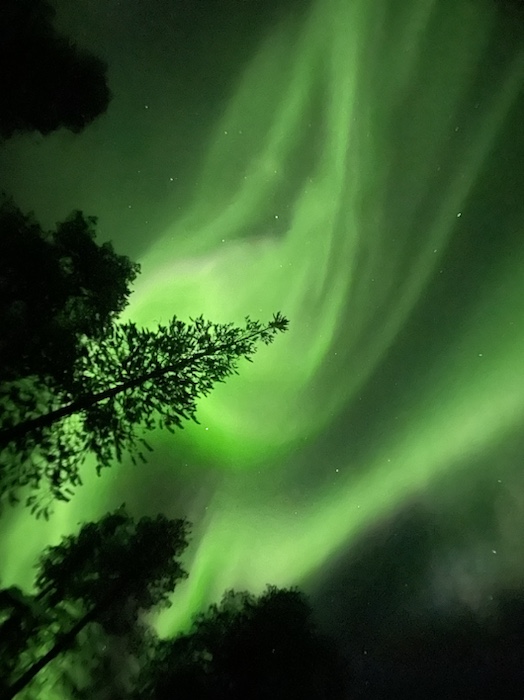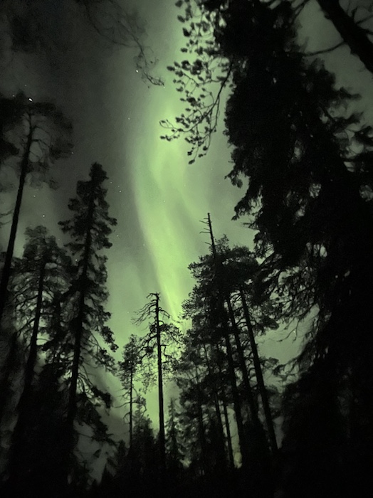 Jag valde den lättare stigen som går till vänster. Efter ett tag uppenbarade sig bitvis klara och massiva norrsken över himlavalvet. Jag tappade andan när jag fick se dem och det var mäktigt att släcka pannlampan och beskåda skådespelet i skyn. Det här var bland de mäktigaste naturupplevelser jag varit med om i skog och mark. Att se norrskenet dansande ovanför mig och jag var helt själv i skogen.