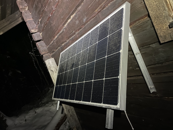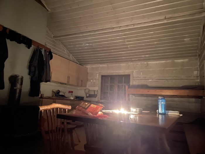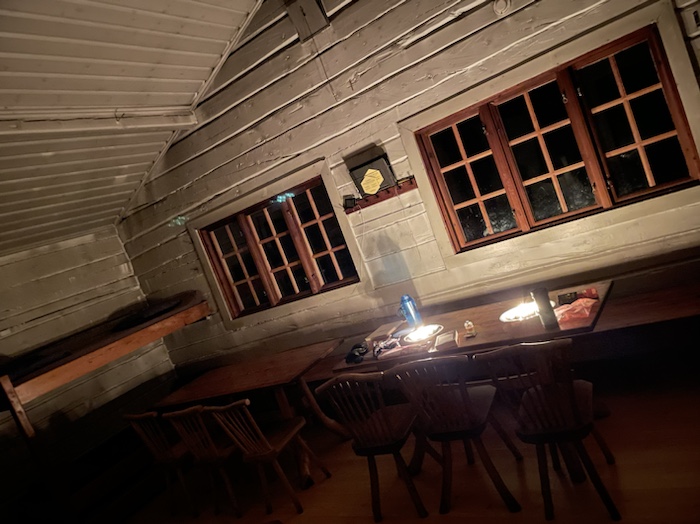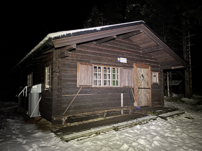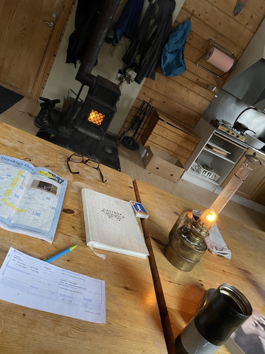 Kom till Falletstugan och upptäckte en timer och en strömbrytare. Vred på timern och tände lampor inne i stugan. Fallstugan hade uppdaterats med ett 12 volts belysningssystem. Jag drack te och åt mörk choklad.