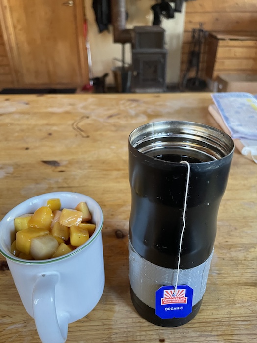 Vaknade tidigt och behövde gå ut på dass. Ett lätt regn föll och det var molnigt. Tände en värmande brasa. Brände handen i kaminen så det blev ett sår som såg ut som Ahlgrens bilar. Kröp ner i sovsäcken igen och somnade om igen.