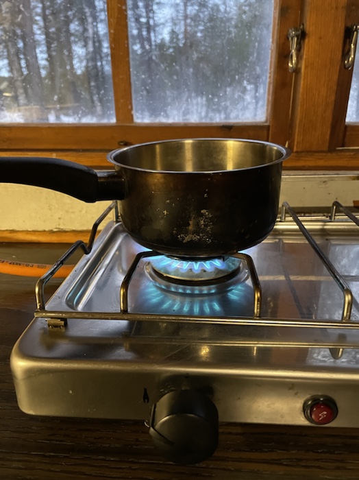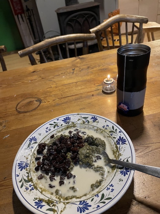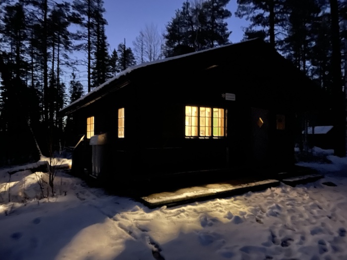 När jag vaknade igen kokade jag gröt och gjorde matchalatte. Det var molnigt ute och ingen synlig sol så det var ingen idé att gå upp i fågeltornet vid soluppgången. Det var en skön värme i stugan. Betalade stughyran på 150:- med Swish. Fick ett sms från polaren Per som tipsade om Depeche Modes album Music for the masses och låten the forest med The Cure. Lyssnade sen på Boards of Canada och Alessandro Cortini. Löste korsord och skrev i bloggen. Hämtade vatten från brunnen och kokade diskvatten för disken.