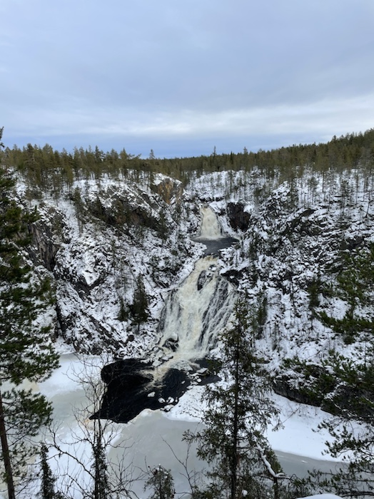 Gick 500 meter söderut och kom till det 42 meter mäktiga Muddusfallet. Skrev i gästboken. Vattenmassorna dånade ner i den djupa gårsså (canyon) i den svarta öppningen i isen.
