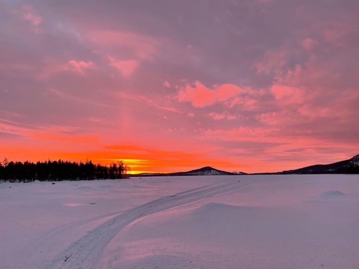 Åkte skidor till Djupviken längs efter Malmens väg. Det var kallt, smällde i träden av kylan, lite norrsken dansade på himlavalvet och det var delvis stjärnklart. Nästa morgon färgades himlen röd. Det var en fin tur till den finaste öppna kojan jag besökt. Fick också en liten flashback till barndomens skolutflykt.