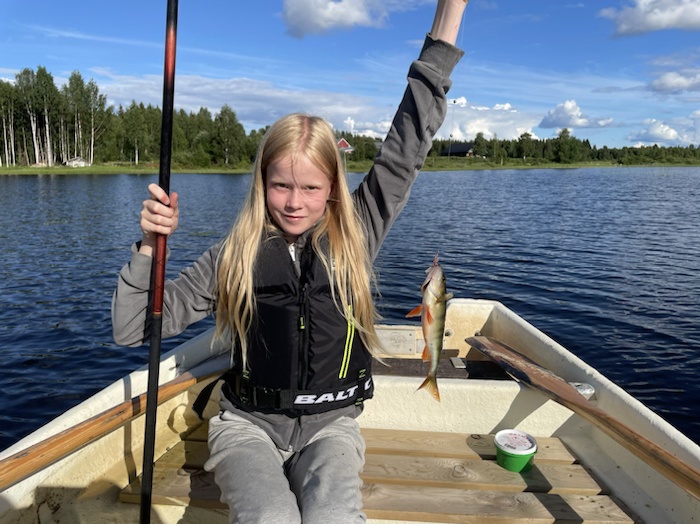 Fiskade några gånger på Åträsket vid stugan och en gång fiskade jag med Roberts barn Cecilia och Kalmer. De hade inte fiskat så mycket tidigare men de var tålmodiga och tyckte om att fiska. Vi rökte aborrarna och njöt av dem till en utsökt måltid.