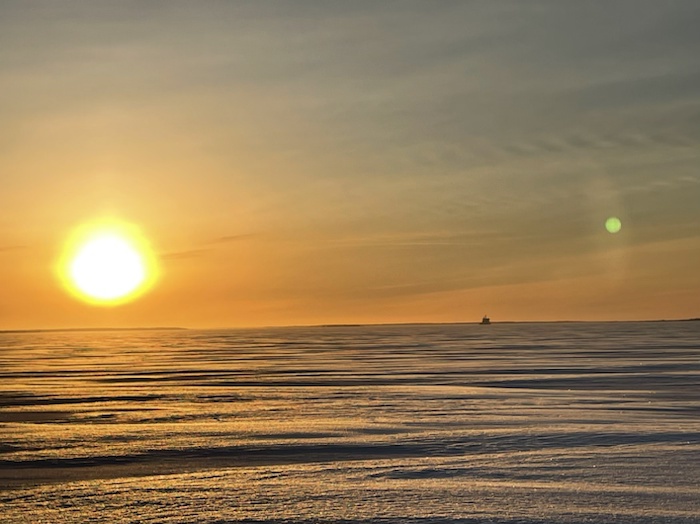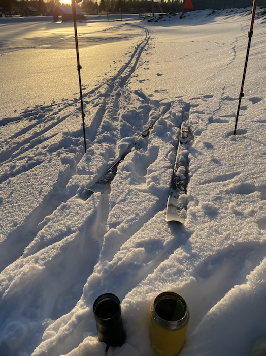 Jag stannade till vid hamnen på Storbrändön. Åt min morotssoppa som jag lagat hemma och hällt i termosen. Kom på att jag glömt mitt förstärkningsplagg i form av en dunjacka så jag kände att jag kylde av snabbt. Åt snabbt maten för att inte bli för kall. Denna dag fanns det inte något draget skoterspår till Kluntarna. Skidåkarna som passerade mig vågade inte ta skotern till Kluntarna på grund av isläget utanför Storbrändön. De skejtade till Storbrändön och vände sen.