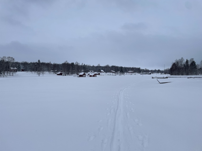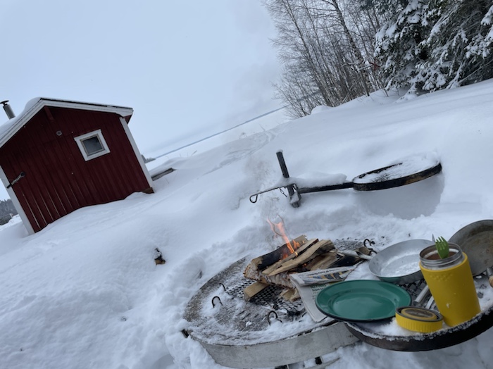 Jag hade länge längtat efter en skidtur i Luleå Skärgård. Det hade snöat hela lördagen och erbjöd dålig sikt och vind medans söndagen bjöd på uppehåll. En fin dag för turskidåkning och utematlagning. Jag lagade hemma en cowboysoppa till mattermosen. Använde sojafärs till soppan. Förberedde också krabbelursmet. Smaksatte dem med saffran. Vispade havregrädde och tog med rårörda lingon till denna dessert. Packade med matcha, agavesirap och baristahavremjölk till matchalatte.