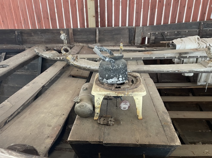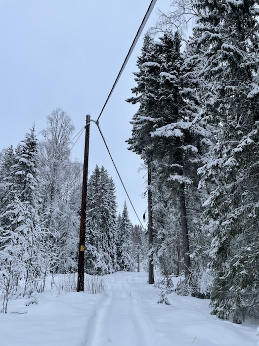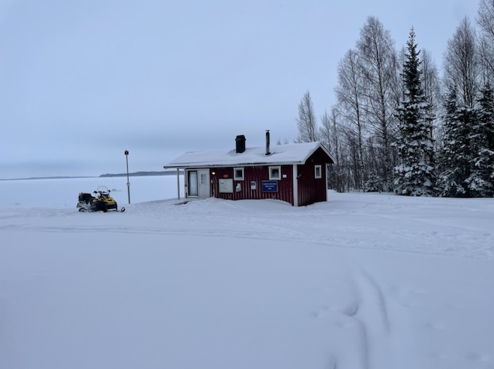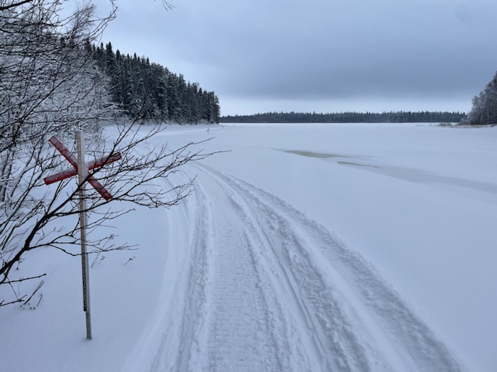 Tände en eld och åt av den varma och goda soppan. Stekte sen krabbelurerna i riktligt med smör. Hade med mig två mindre stekpannor istället för den tunga muurikkan. Safffanskrabbelurerna blev riktigt goda och jag blev mer än mätt. Det blev faktiskt dessert för fyra personer. Mötte sen en man som var på besök i Luleå. Han kom ursprungligen från Unbyn utanför Boden och ville ge sin 18 år fyllda dotter en fin upplevelse på Hindersön. Barnen pratade tyska. Han tyckte det var tyst och lugnt på ön. Det kom en skoter med två män till raststugan och jag frågade om det var bra och då svarade den äldre mannen att det skulle bli bättre när de fick laga korv. Jag var sen redo för en uppfriskande skidtur i omgivningarna. Spände på mig mina nya norska turskidor och åkte efter ett färskt skidspår i riktning mot Östisundet .