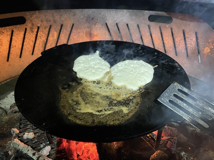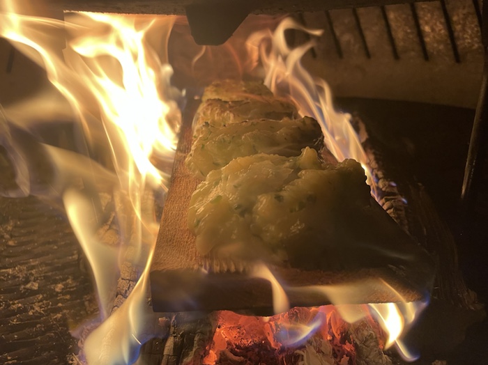 Tände en brasa i utegrillen och stekte först tre ägg på muurikkan. Det blev ägg istället för plankgrillad fläskfilé. Tillagade moset på muurikkan till det plankgrillade potatismoset.