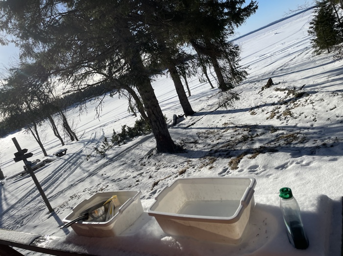 Det blev högrevsburgare igen till lunch. Drack te och åt mörk mustig choklad. Njöt av det vackra vädret. Deltagare på en skidtur med Friluftsfrämjandet passerade och en av dem kände jag igen på rösten efter en stund. De skulle sova i 10-bäddsstugan. Högg ved och eldade i bastukaminen. Tog mig sen ett välgörande bastubad efter lunchen. Varmt, fuktigt och skönt. Jag upplever tiden på ett annat sätt så här ute i naturen. Tiden känns långsammare än vanligt.