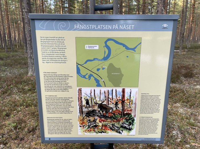 Kom till en informationsskylt där det fanns ett fångstgropssystem med 11 fångstgropar. På en sträcka på 5 kilometer finns det 20 fångstgropssystem. De kan vara så gamla som 7000 år. De användes främst för jakt på älg.