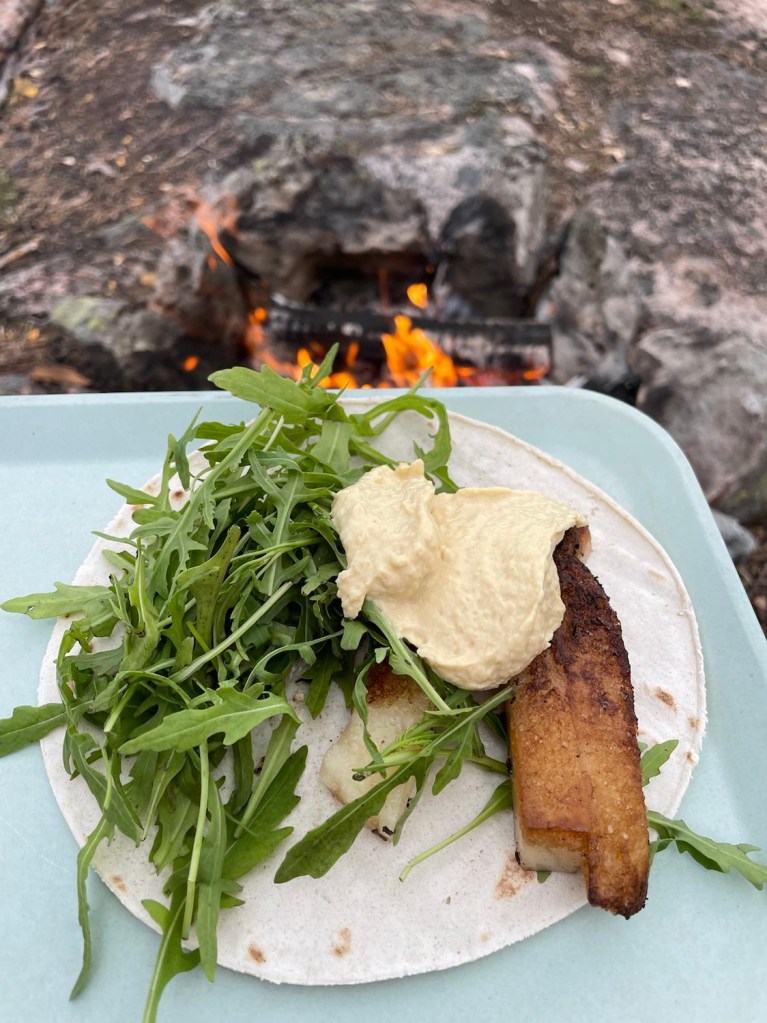 Det blev vegansk ost, ruccola och hummus i glutenfria tortillabröd. Osten var dock inte så god.