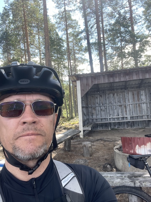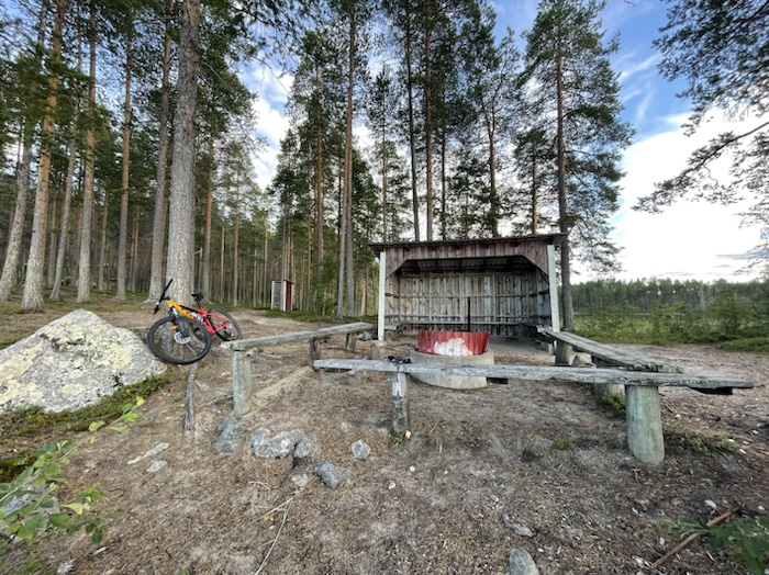 Körde från Noret till den lokala matbutiken. De hade inte rätt gasflaskor till mina campingkök. Köpte hårdbröd och renost till lunch samt chips och coca cola till att äta i bilen. Det gick mycket energi att paddla till slutdestinationen. Killen som jobbade i butiken berättade att Margareta var hans moster. Körde sen mot Östersjön och min favoritcampingplats vid Isälvsleden. Anlände till den lilla parkering till stigen mot rastplatsen. Åt smörgåsar och bytte om till cykelkostymen. Packade ett äpple och chokladbit i camelbacken och blandade resorb i en sportflaska. Cyklade ner till vindskyddet och det var ingen där. Hoppades att campingplatsen skulle vara ledig till jag kom tillbaka från cykelturen.