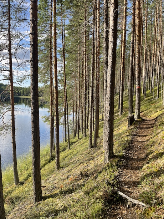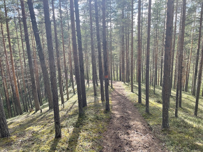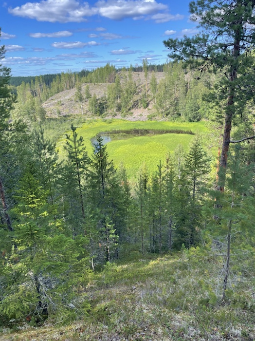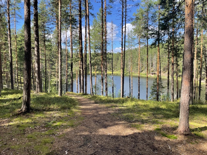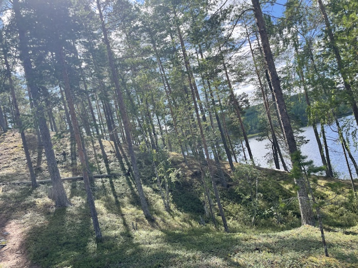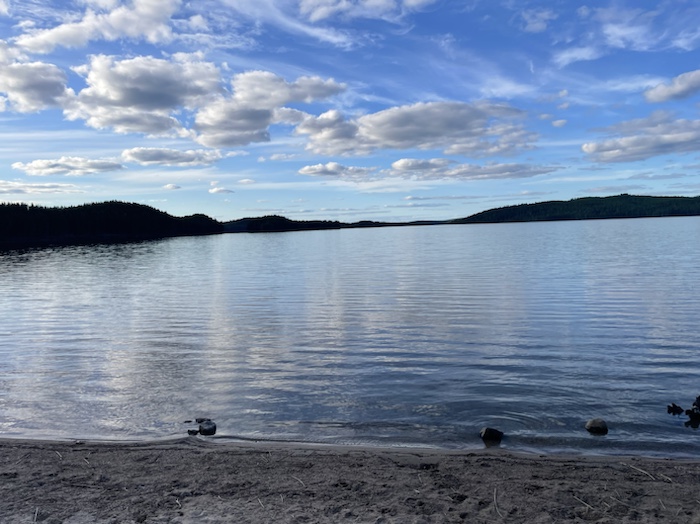 Cyklade mot rullstensåsen Sundkammen som är den mest spektakulära delen av Isälvsleden. Mötte en barnfamilj och mannen sa till mig som han sagt till andra cyklister att vi skulle passa på att njuta av utsikten. Kom till slutet av Sundkammen. Djupsundssjön till väster, Östersjön i öster och Åmträsket i norr. Det finns en roddled för att ta sig över vattnet och fortsätta leden mot Åmsele. De häftigaste delarna på Isälvsleden är Juvikskammen nära Åmsele, Sundvikskammen och Hjuviksåsarna.