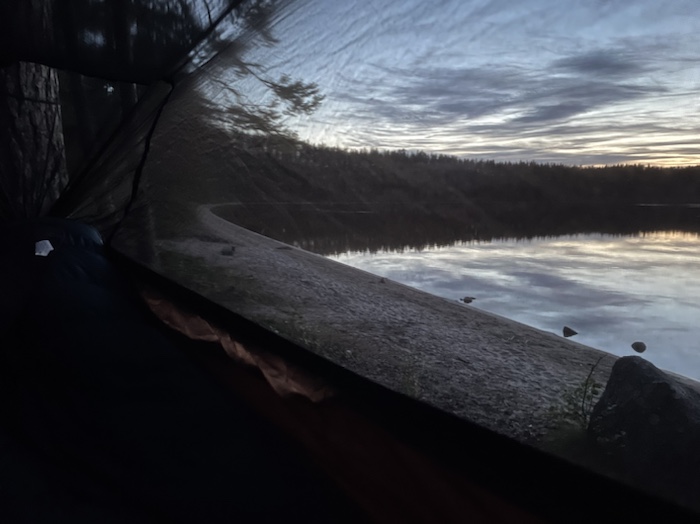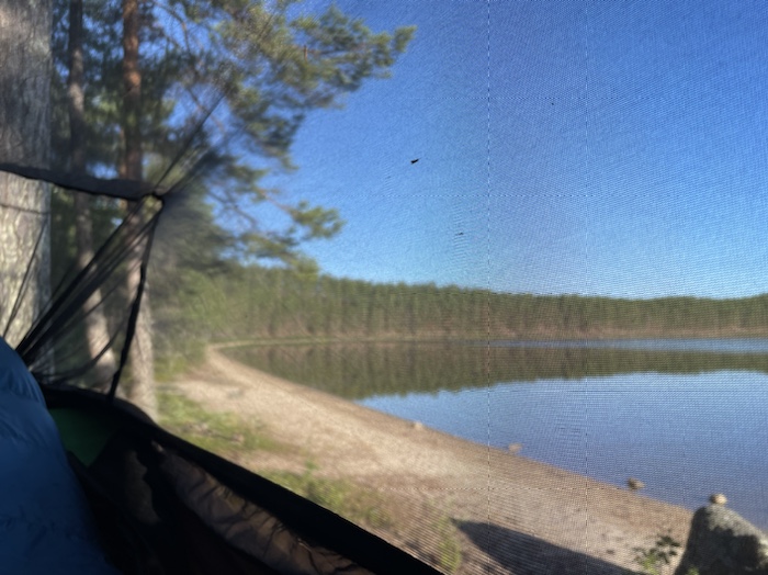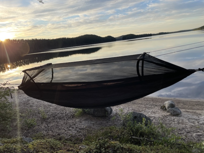 Bytte från lycrakostymen till adamskostymen. Jag tog mig ett svalkande dopp i den stilla Östersjön och tvagade min lekamen. Kröp sen ner i hängmattan. Vaknade på natten av att det kändes kallt mot ryggen. Jag hade glömt lägga i det uppblåsbara liggunderlaget. Klev till slut upp och blåste upp liggunderlaget och lade in det i hängmattan. Låg mycket varmare och skönare efter det.
