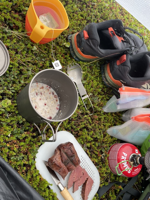 Hittade hjortron och fick mig en god förrätt. Stannade för lunch vid en sten efter jag gått ungefär 8 km. Det började regna precis när jag väntade på att maten skulle bli klar. Jag tog på skalkläderna och packade ihop allt förutom påsen med frystorkat som jag började äta i regnet. Det blev ingen te och chokladbit denna gång. Det fick vänta.
