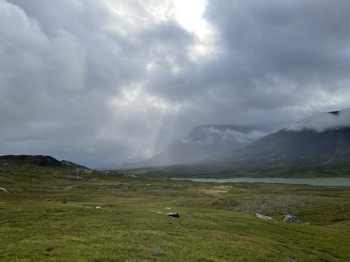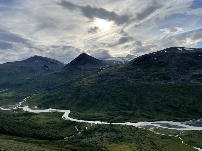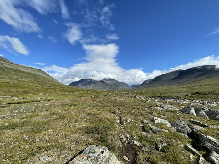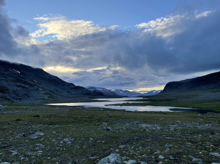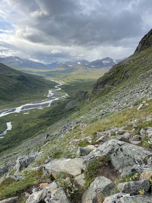 Jag såg tre tält vid foten på Låddebakte. Det blåste hårt uppe vid Snavvavagge. Det var mycket tungt för knät att gå nerför den branta stigen. Sen när stigen planade ut gick det bättre. Letade lite och hittade en fin tältplats med en mäktig vy mot Rapaselet.