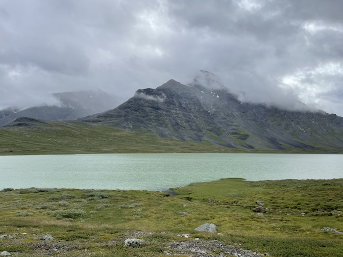 Mötte tre andra vandrare. Två äldre herrar och en yngre herre. De berättade att de var på sluttampen av sin Sarekvandring och skulle sluta i Suorva. Jag såg ett orange tält högre upp mot bergsryggen. Kom till sjön som anses som den vackraste i Sarek, Bierikjavvre med sitt turkosgröna vatten.
