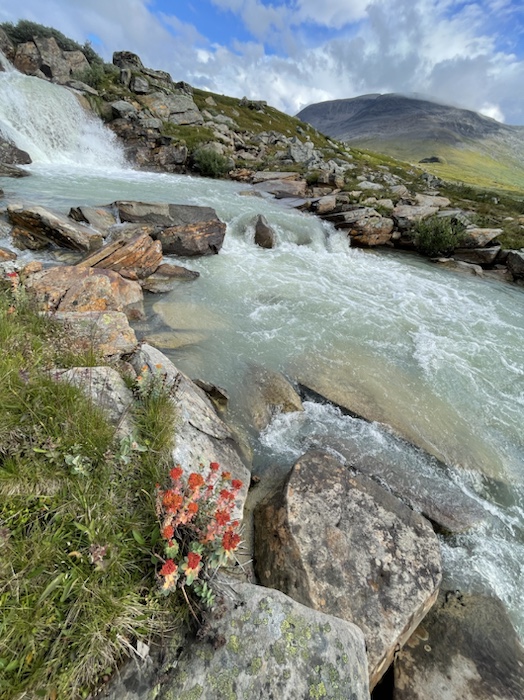 Jag var tacksam att det var längesedan det regnade och att det fortfarande var uppehåll. Jag satt på en sten bredvid tältet och skrev dessa ord och drack min kopp te och tog en mintchokladbit. Ett vattenfall högre upp och jåhken brusade i olika toner från olika håll. Någon få slö mygga satte sig på mitt byxben.