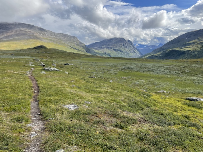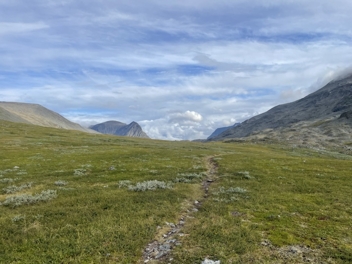 Mötte ett tyskt par som var ute i Sarek fem veckor och skulle vara på vandring totalt sex veckor. Jag fick tips på var jag kunde passera över till stigen som går mot Rapadalen och bästa tältplatsen med vy mot Rapaselet. De hade sett sett älgar nere i Rapaselet med kikare. Stigen var bitvis tydlig.