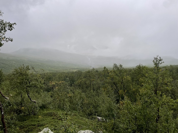 Hörde sen röster och det kom två vandrare, en kort och en lång. De hade vandrat 25 km under dagen. De hade också gått samma väg som jag och gått över biflödet till Rahpaädno och den korta av sällskapet hade passerat det djupa vadet och den långa hade vadat över på ett annat ställe. De ville också ta båten nästa dag. Det började regna strax efter att de anlände. De letade tältplats och reste sitt tält bredvid mig. Det regnade bitvis mer än det regnat hittills. Myggorna samlades i toppen på taket av tältet.