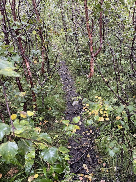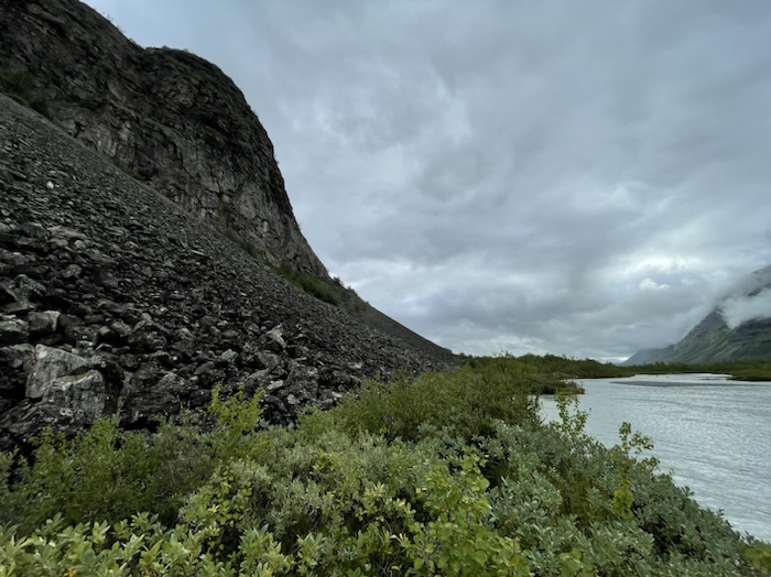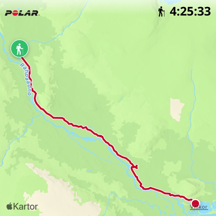 Jag kom till ett biflöde till Rahpaädno och funderade på varför jag skulle passera den. Tänkte att det var en genväg. Vattnet var grumligt av glaciärsediment. Passerade det knähöga vattendraget med lätthet. Fortsatte på stigen och den gick igenom ett mossbeklätt landskap och stigen var mycket svår att se. Jag kom till ett till grumligt vad och det gick till grenen. Gick en bit till och kom till ett klart vattendrag. Jag klev ner och vattnet gick upp till naveln. Jag tappade andan av kylan. Det var djupast mot andra sidan och den hade en hög flodkant upp till marken. Det var tufft att ta sig upp. Jag gick sen på grått glaciärsediment med buskage och ibland vattenfylld stig. Passerade Nammatsj och lite blockterräng. Såg en tältplats eller två och fortsatte framåt men stigen vek av norrut så jag vände tillbaka och gick på stigen som ledde till vattnet.