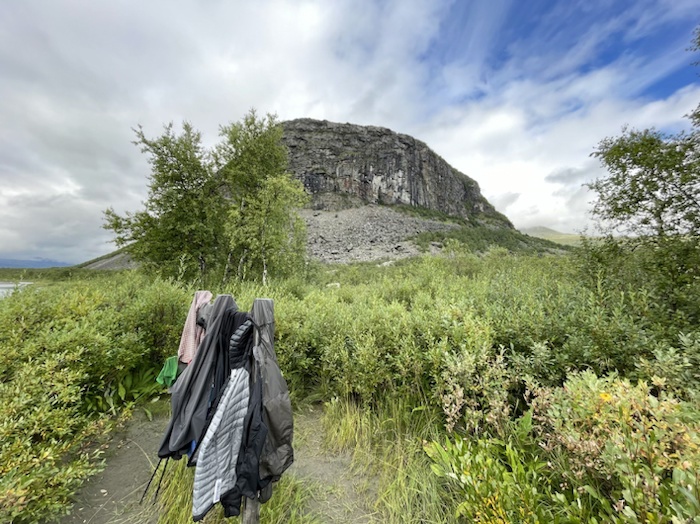 Jag tog av mig alla kläder förutom kortkalsongerna och bytte till underställströjan. Hängde upp kläderna på tork på laponiaskylten. Tog fram sovsäcken, tältet och liggunderlaget för att torka i solen.