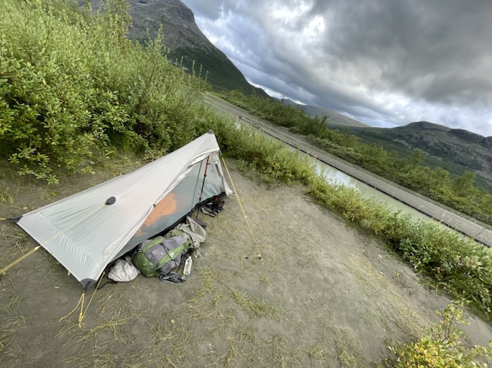 Jag reste tältet istället och lade mig för att vila där istället. Hade plockat in alla grejer i absiden. Tänkte laga mat ute och skriva men så började det att regna. Jag flyttade in matlagning under tältduken.
