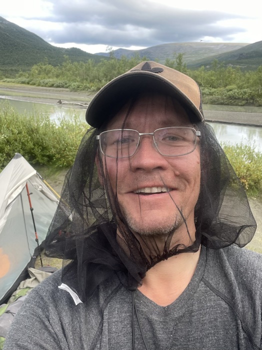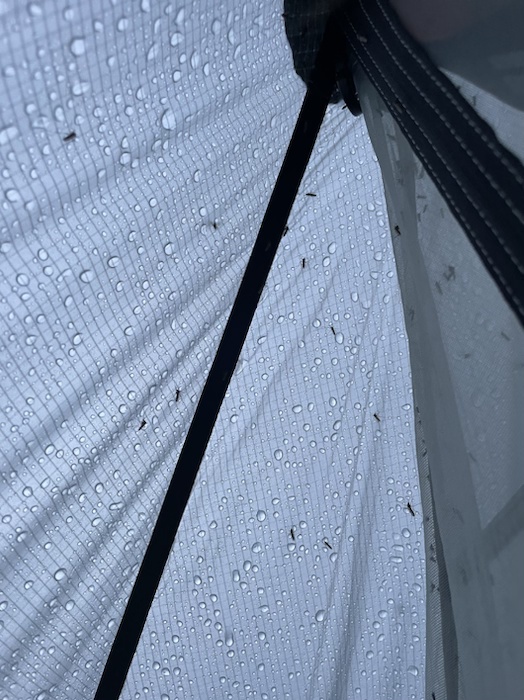 Tog på mig dunjackan och regnbyxorna som skydd mot de blodtörstiga flygfäna. Det var så mycket mygg så jag tog på mig myggnätet för första gången. Lade mig för att vila på liggunderlagen men det var inte skönt och det var massor med mygg. Detta var dagen med mest mygg.