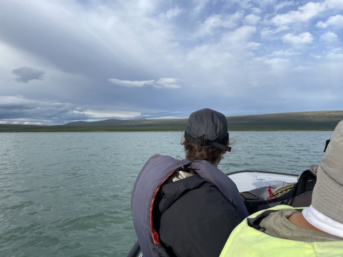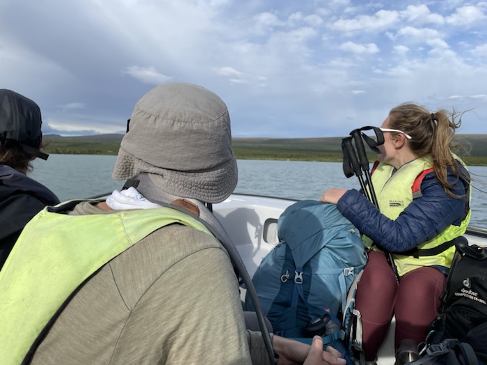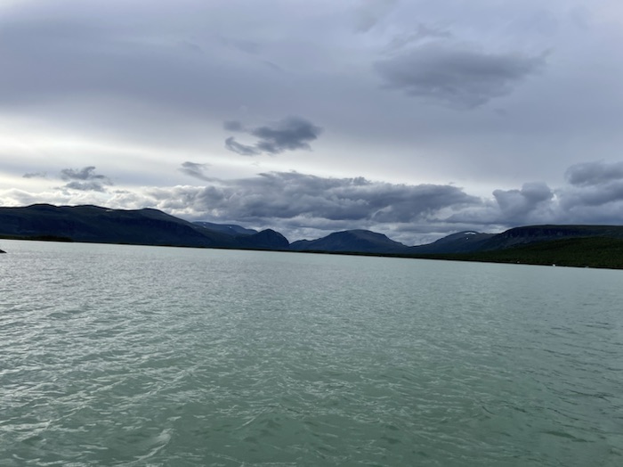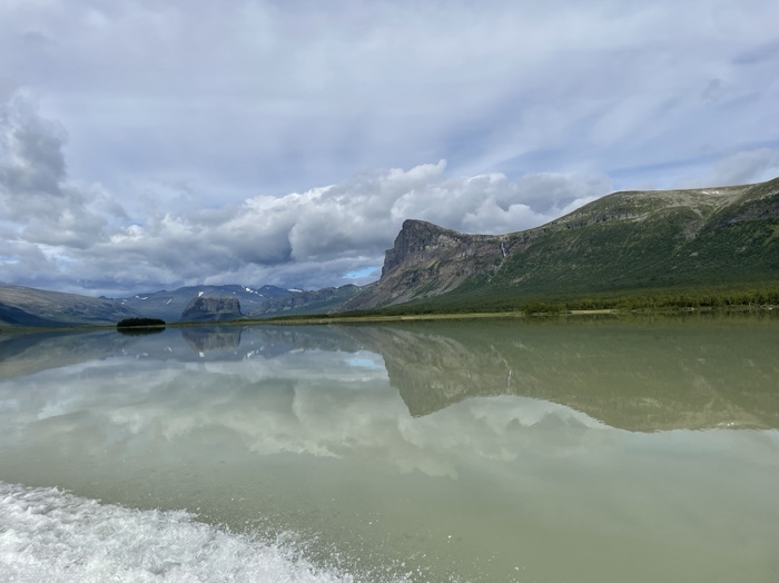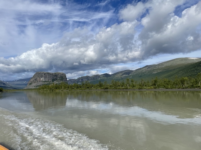 Det regnade kraftigt under natten med sporadisk åska på långt avstånd. När jag vaknade på morgonen och klev ut ur tältet hade det stänkt från det grå glaciärsedimentet på ryggsäck och utrustning. Möttes av ett riktigt vackert väder med sol och spridda lätta fjädermoln över fjällen. Båten kom vid 9:30 och vi passerade förbi det mäktiga bergsmassivet längs efter vattendraget. Fick se Skierfe från sjösidan som jag skulle ha vandrat upp på enligt den ursprungliga planen.