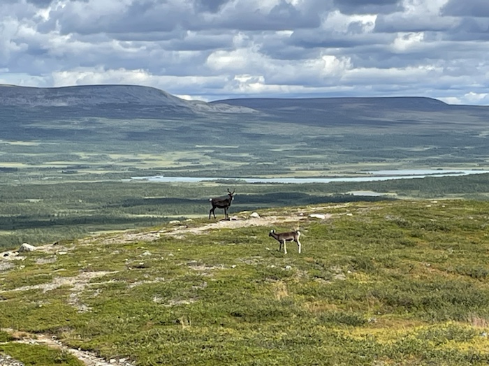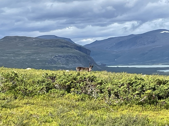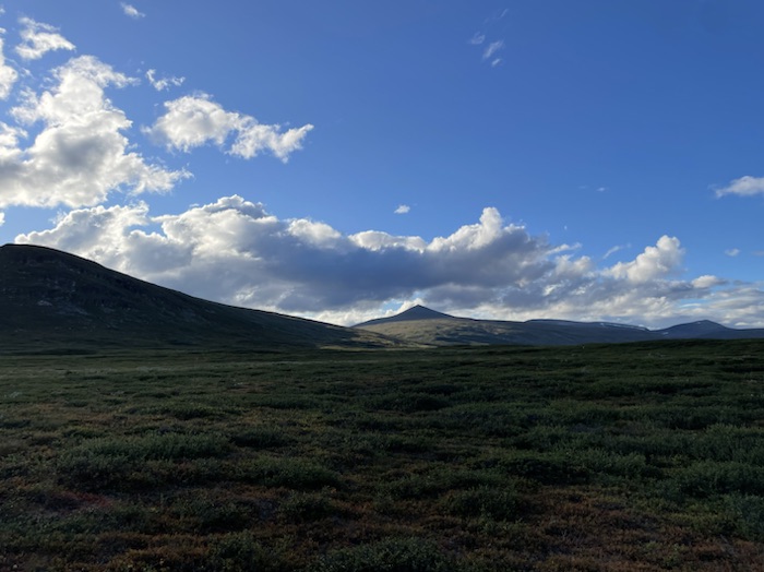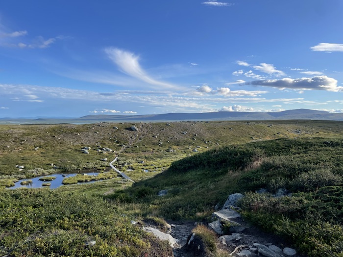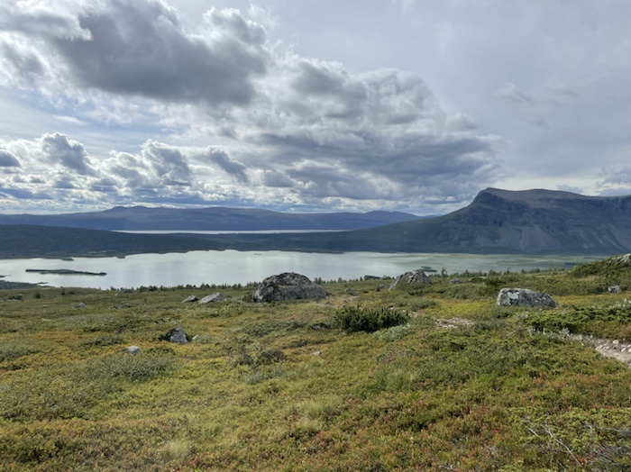När jag kom upp på högfjället så hade jag täckning för första gången sen dag 1. Min far hade spelat in ett mobilsvar och jag ringde och lämnade ett meddelande till honom. Ringde och bokade båttransporten över Sitojaure. Åt en powerbar och drack vatten på en sten. Mötte en vandrare från Hong Kong som kom från riktning Skierfe.