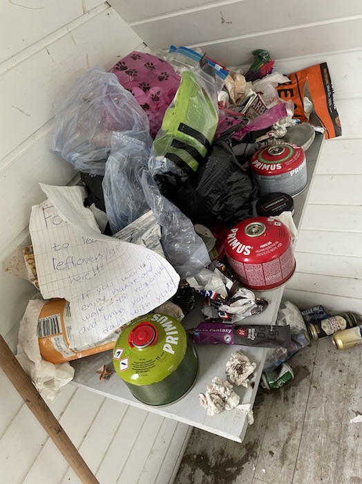 Kom till en raststuga vid Svinjnne som tyvärr var svinig. Självklart tar var och en med sig sitt skräp som den bär med sig ut på vandringsturen. Inte så mysigt att sitta i den raststugan.