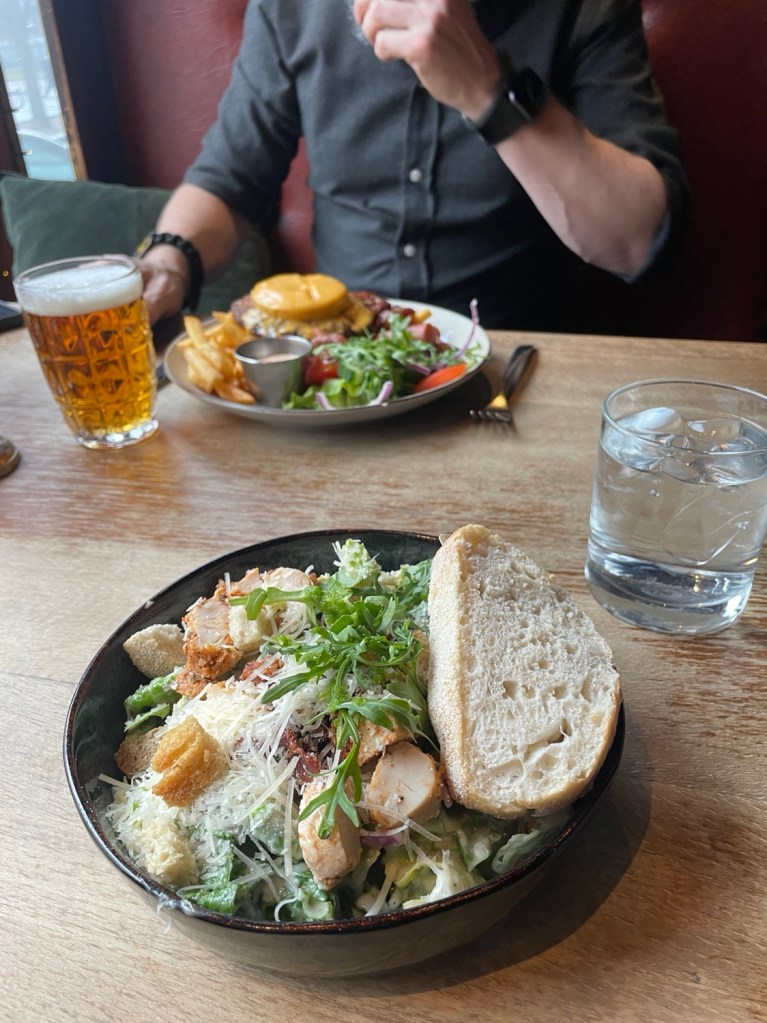 Kenneth beställde in en mixed grill, en rätt som har gamla anor på Tennstopet, äldre än honom själv. Jag beställde en riktigt god caesar sallad.