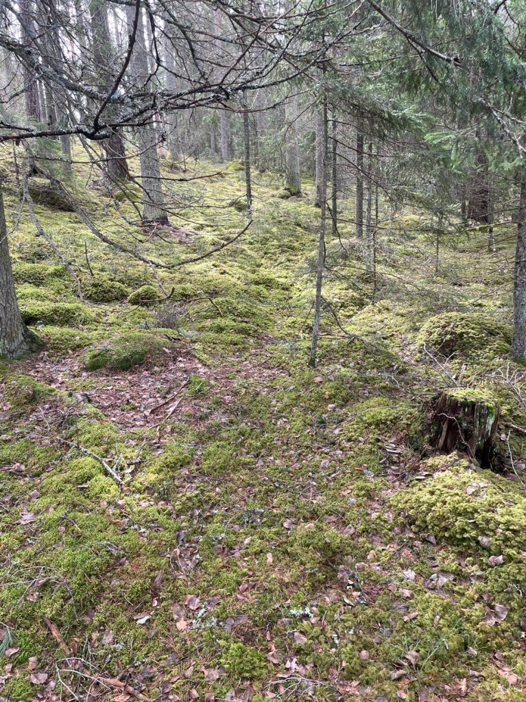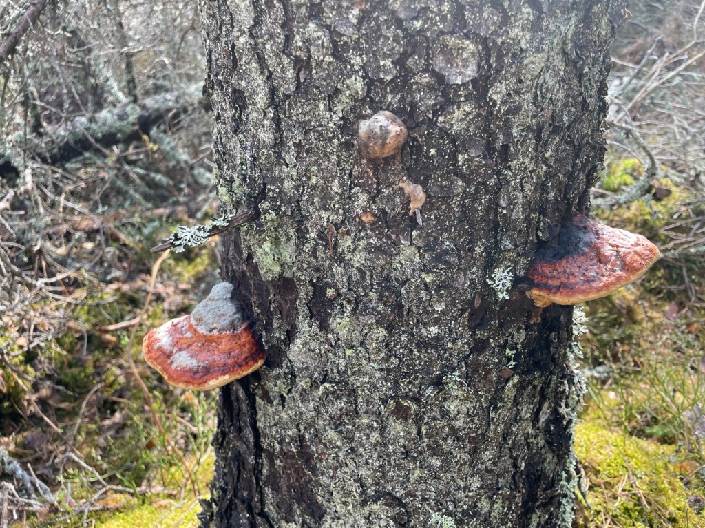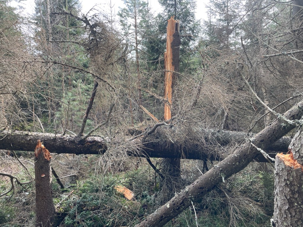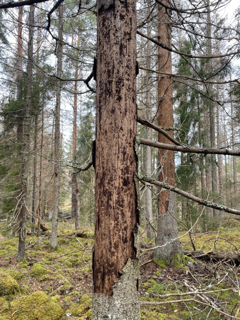 I början på leden fanns en varningsskylt för nedfallna eller fallande träd. Området hade blivit utsatt för granbarkborrar.