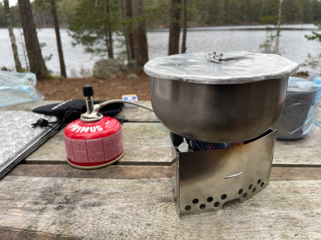 Vi kom till den nästsista grillplatsen och stannade där. Båda kokade mat för lunchen. Anders hade en Trangia Triangel med Trangias gasbrännare. Han hade också en kastrull från IKEA och ett hemmagjort grytlock. Anders bjöd på lakritschoklad som jag avnjöt till teet. Det började blåsa upp och det föll ett lätt regn.