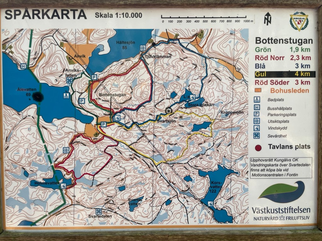 Styrde mot Bottenstugan vid Svartedalens Naturreservat. Sista delen av vägen var en kurvig och smal grusväg. Ställde mig på den stora parkeringen där det stod några bilar. Det kom en man som berättade att han vandrade i området varje vecka. Jag frågade om tips på ett fint vindskydd. Han rekommenderade att gå på Bohusleden och till ett vindskydd vid Stora Iglekärr.