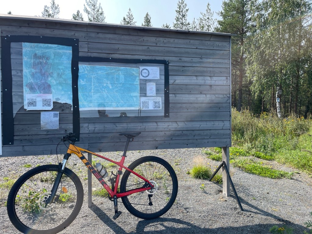 Vi startade vid toppstugan och cyklade nerför skidbacken. Det var inte markerat början av banan. Längst ner fanns det en grillplats med ett välfylld vedbod. Där började skyltarna. Thomas ledde oss efter den blå leden.