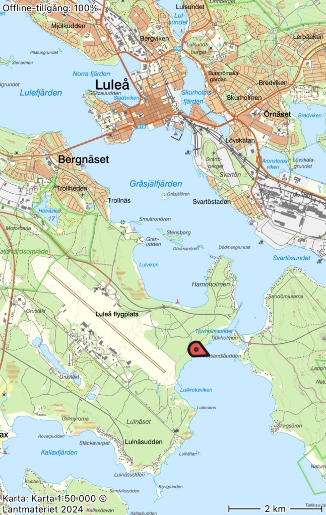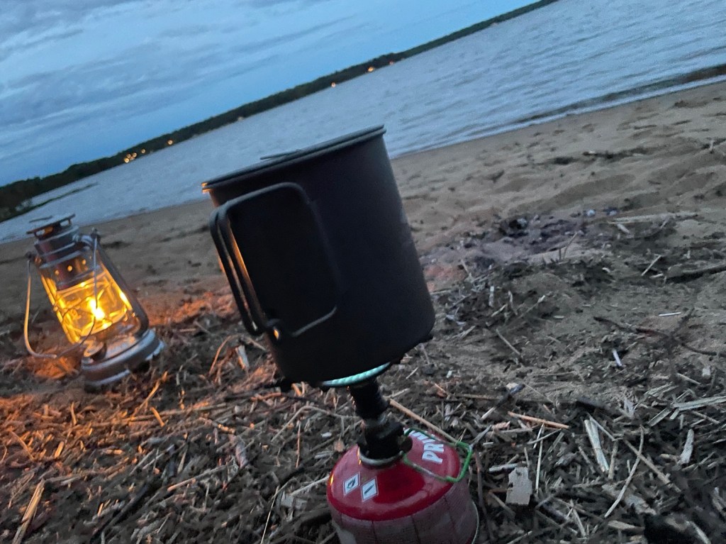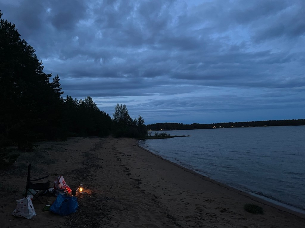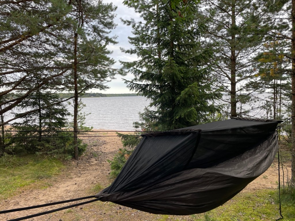 Hade planerat för ett enkelt och riktigt nära evenemang till Luleå i Facebookgruppen Vandringsvänner. Ingen hade anmält sig men jag var ändå sugen att laga mat ute och sova i hängmattan. Västra Hamnholmen ligger endast 11 km från centrala Luleå. Det går utmärkt att cykla hit. Tar du bilen får du vara beredd på de stora och djupa groparna på grusvägen som är lika breda som vägen. Det går också ta lokalbussen till Luleå Airport och ta en promenad hit. Hade på förmiddagen cyklat med min träningskompis Thomas och hans son på Gruvberget i Boden. Vilade sen hemma och packade inför övernattningen. Styrde caretan till stranden med The Thes album Soulmining från 1983 i bilstereon. Kunde köra nära stranden. Det blåste en del så jag hängde upp hängmattan i skydd av träd.