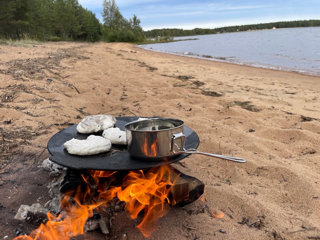Hade förberett de torra ingredienserna till bannock hemma i en plastburk. Använde Lailas glutenfria mjöl, ett blått paket. Hällde på vatten i mjölblandningen. Det går inte lika lätt att blanda ihop vatten med mjölet som med vanligt mjöl. Hällde i olja på slutet och blandade sen ihop degen. Stekte fyra bannock på stekhällen och kokade vatten i den lilla kastrullen. Jag borde haft något att hålla i det varma handtaget.