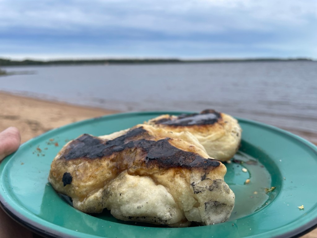 Satte undan två bannock i plastburken till frukost och åt två bannock med lönnsirap och med grönt te till. Det var gott men blev lite mycket då de är så mättande. De hade räckt med en.