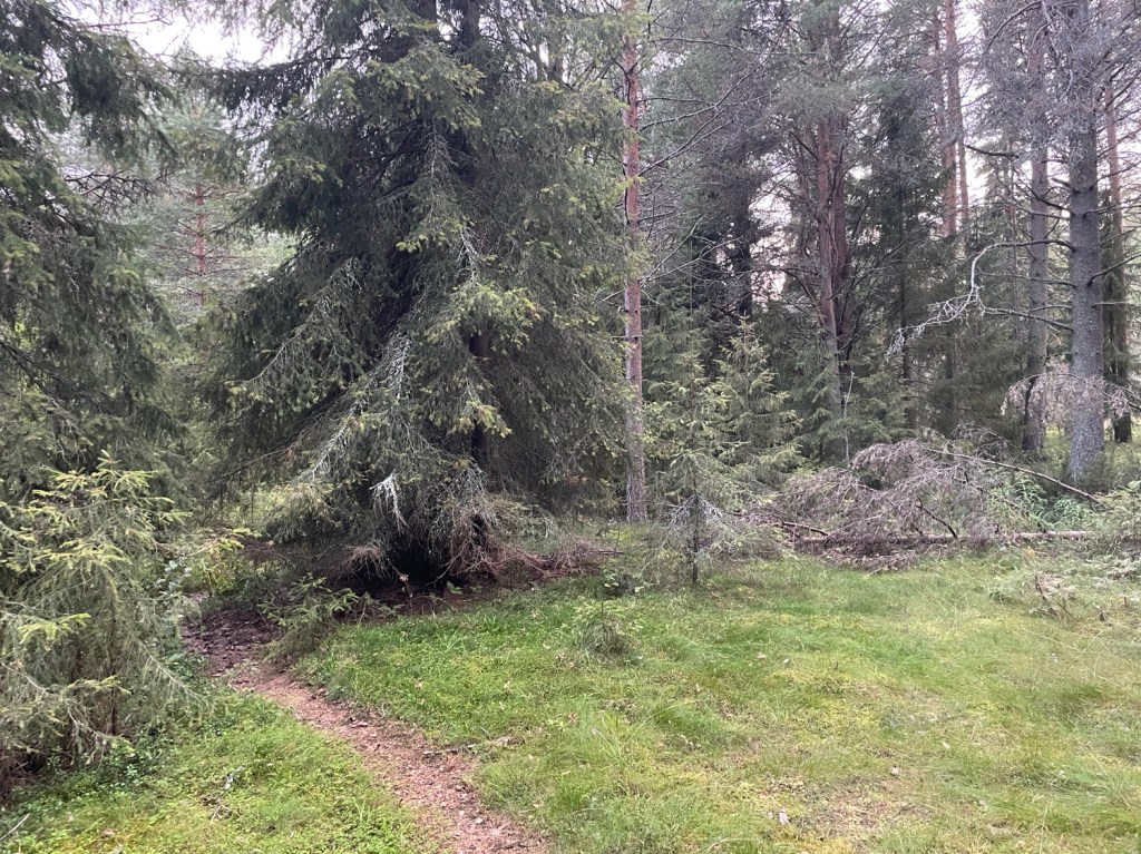 Gick på en stig genom skogen och såg ett tält och sen cykeln.