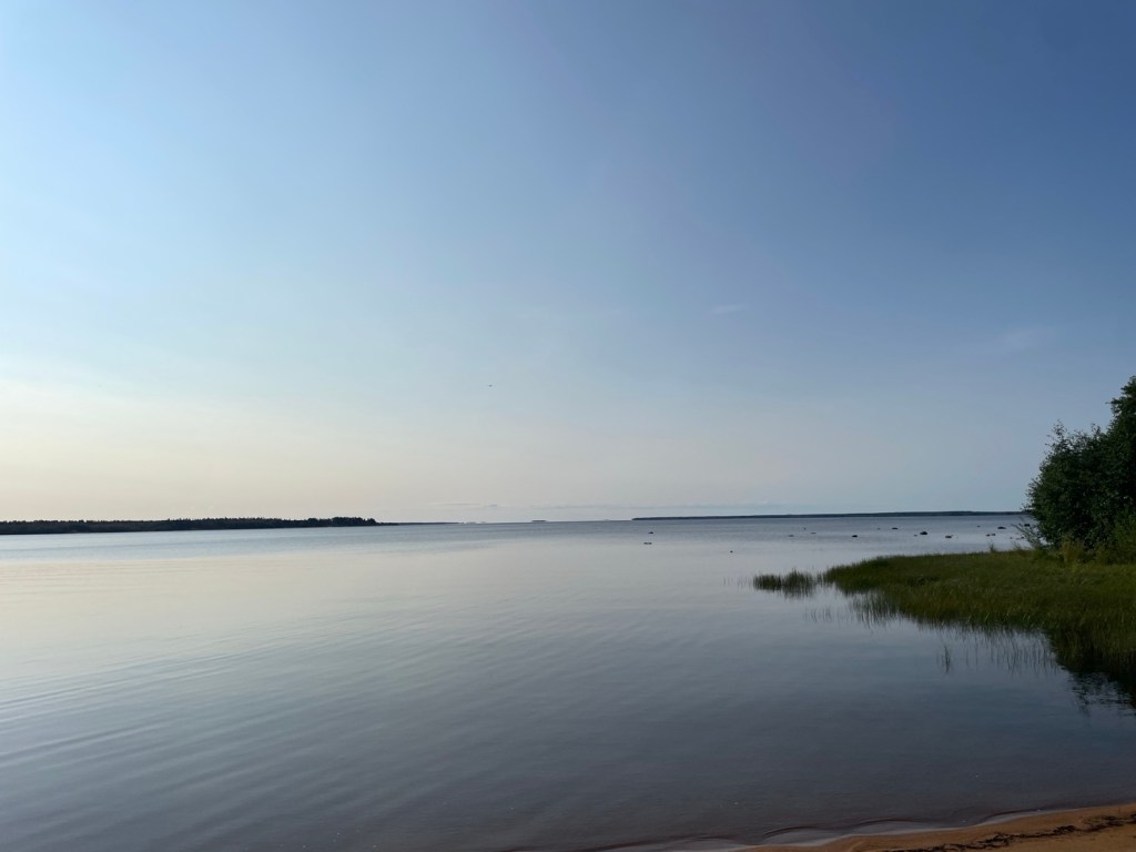 Gick sen upp och kokade vatten till morgongröten och teet. Åt två bannock med lönnsirap. Det blev för mycket vatten till min egen instant oatmeal så den blev blaskig. Satt sen och njöt av finaste frukostplatsen med det ovanligt stilla havet.