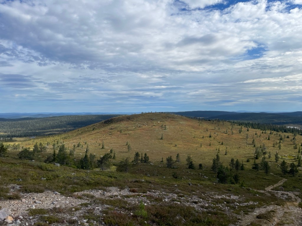 På väg ner från toppen. Landskapet såg ut som ett högfjällslandskap med ljung och sparsmakat med träd.