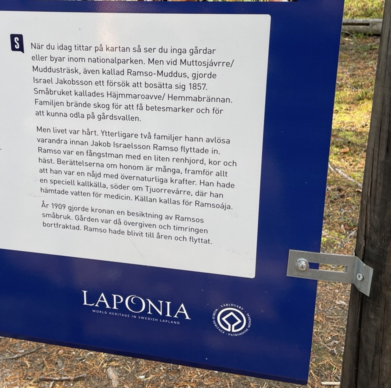 Hade läst Muddus-Den gamla skogen av Edvin Nilsson och Lennart Arvidsson som beskrev att Jakob Israelsson Ramso funnit en bubblande källa som benämndes Ramsoaja. Källan hade magiska egenskaper och var belägen strax söder om Tjuorrevarre. Vi planerade att titta efter den källan men hade ingen exakt position.