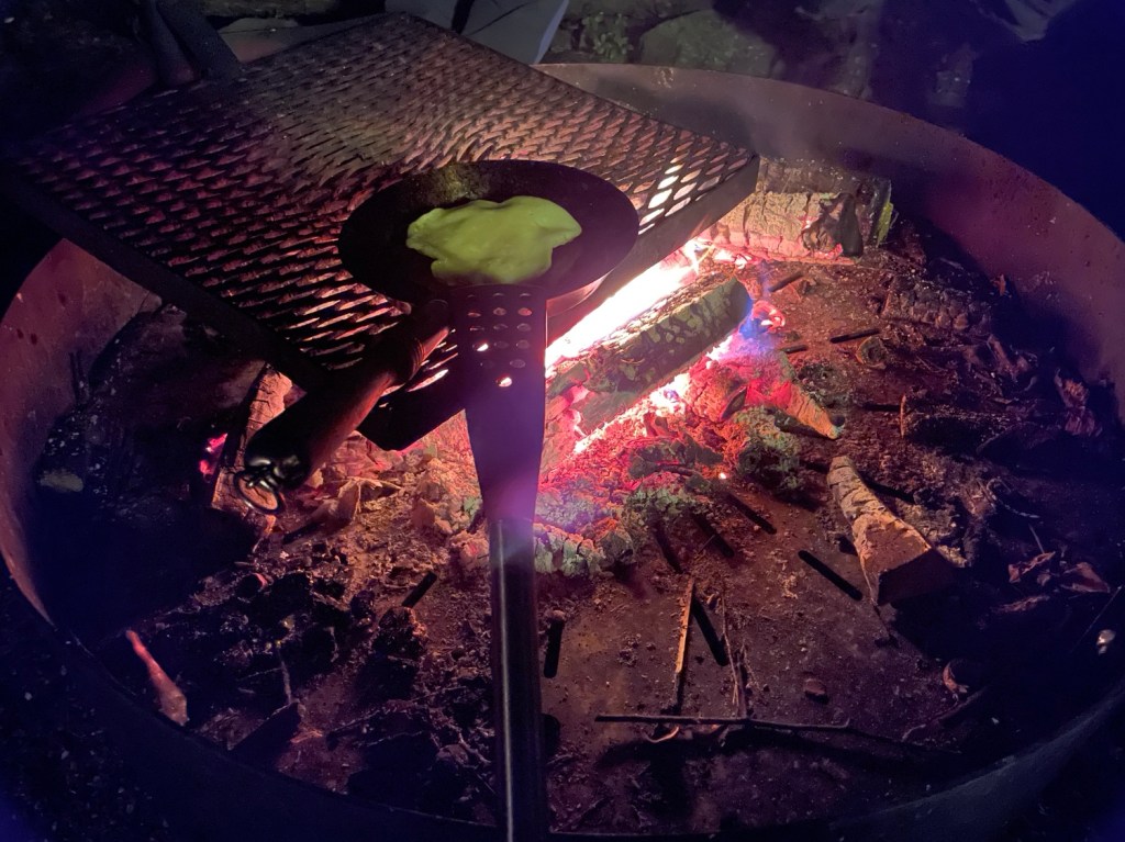 Hade förberett ingredienserna till bannock i en påse. Hällde i vatten och blandade till en deg. Stekte på detta och bjöd desserten till sällskapet. Serverades med lönnsirap.