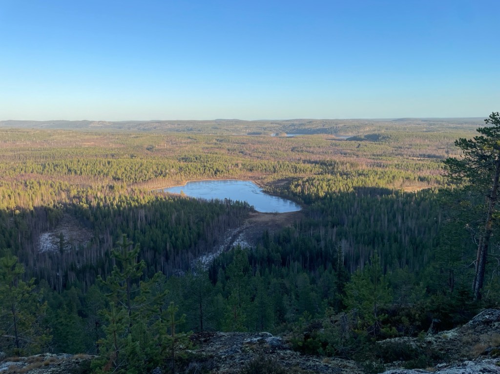 Vi gick till den östra sidan och blickade ut mot ett skogsbeklätt landskap utan hus och byggnader. Åter uppe på leden mötte vi ett par med hund som bodde i Råneå.