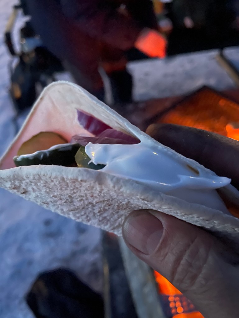 För min del blev det en ny enkel favorit när det kommer till utematlagning, fiskpinnar i bröd med asiatisk topping. Jag använder dock glutenfria tortillabröd och vanlig majonnäs istället för srirachamajonäs. Det blev gott men mina fingrar blev riktigt kalla.