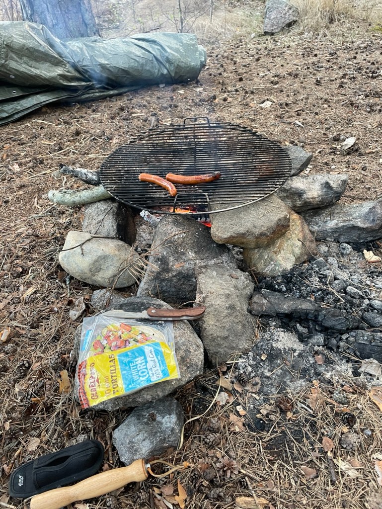 Letade grenar, pinnar och hittade en stock för att starta en brasa. Hittade ett grillgaller. Grillade kabanoss på grillgallret och åt dem i tortillabröd tillsammans med räksallad som jag köpt i lugna Katrineholm.